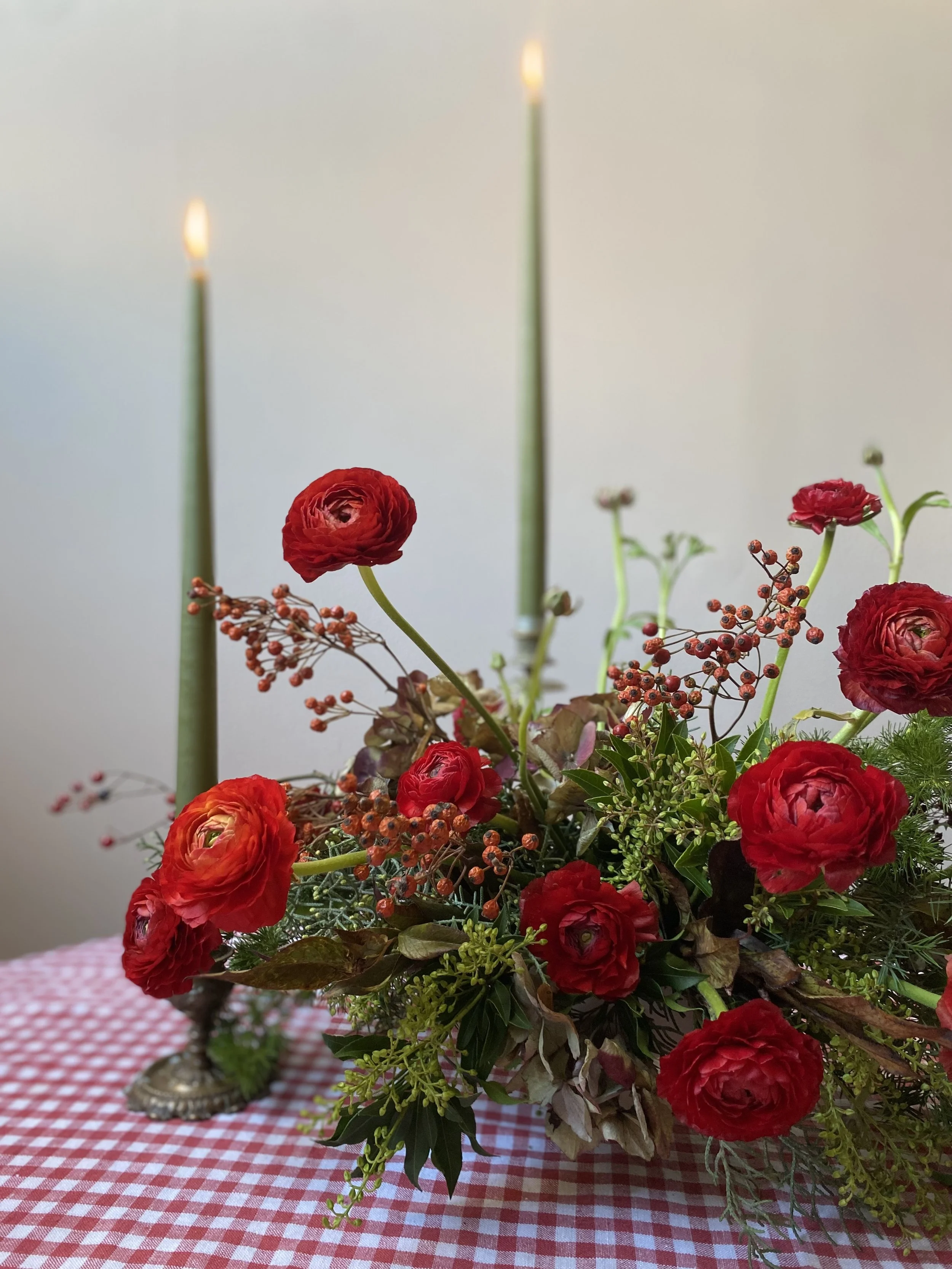 We would love to provide fresh flowers for your home or event throughout December. Additional table styling items such as candlesticks, candles, tealight votives and napkin ribbons are available.