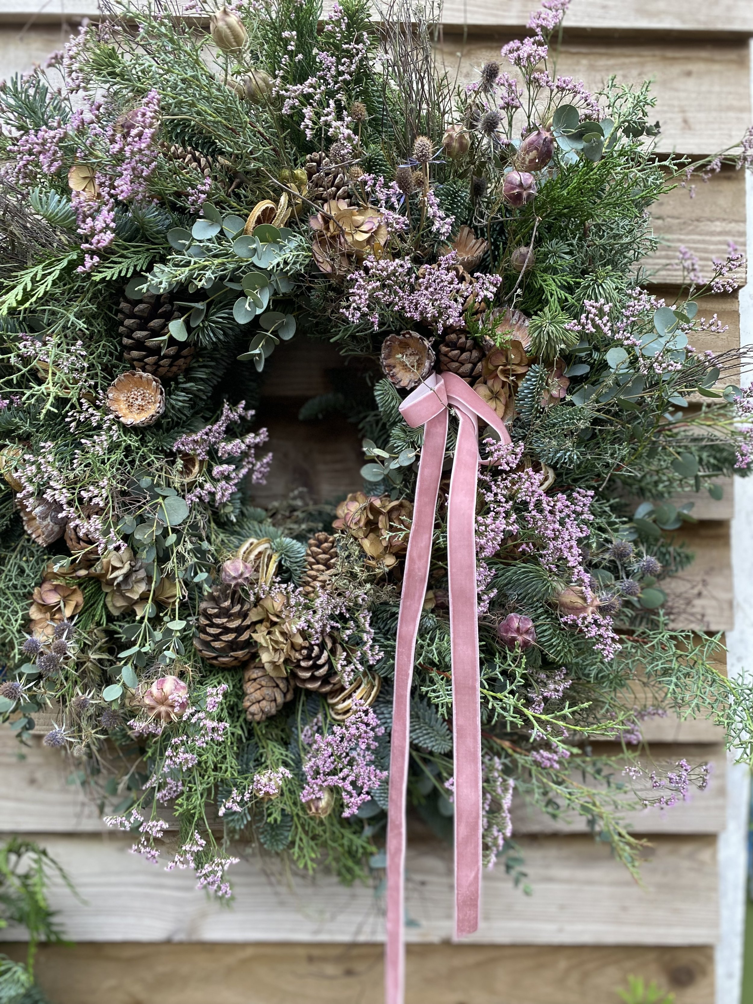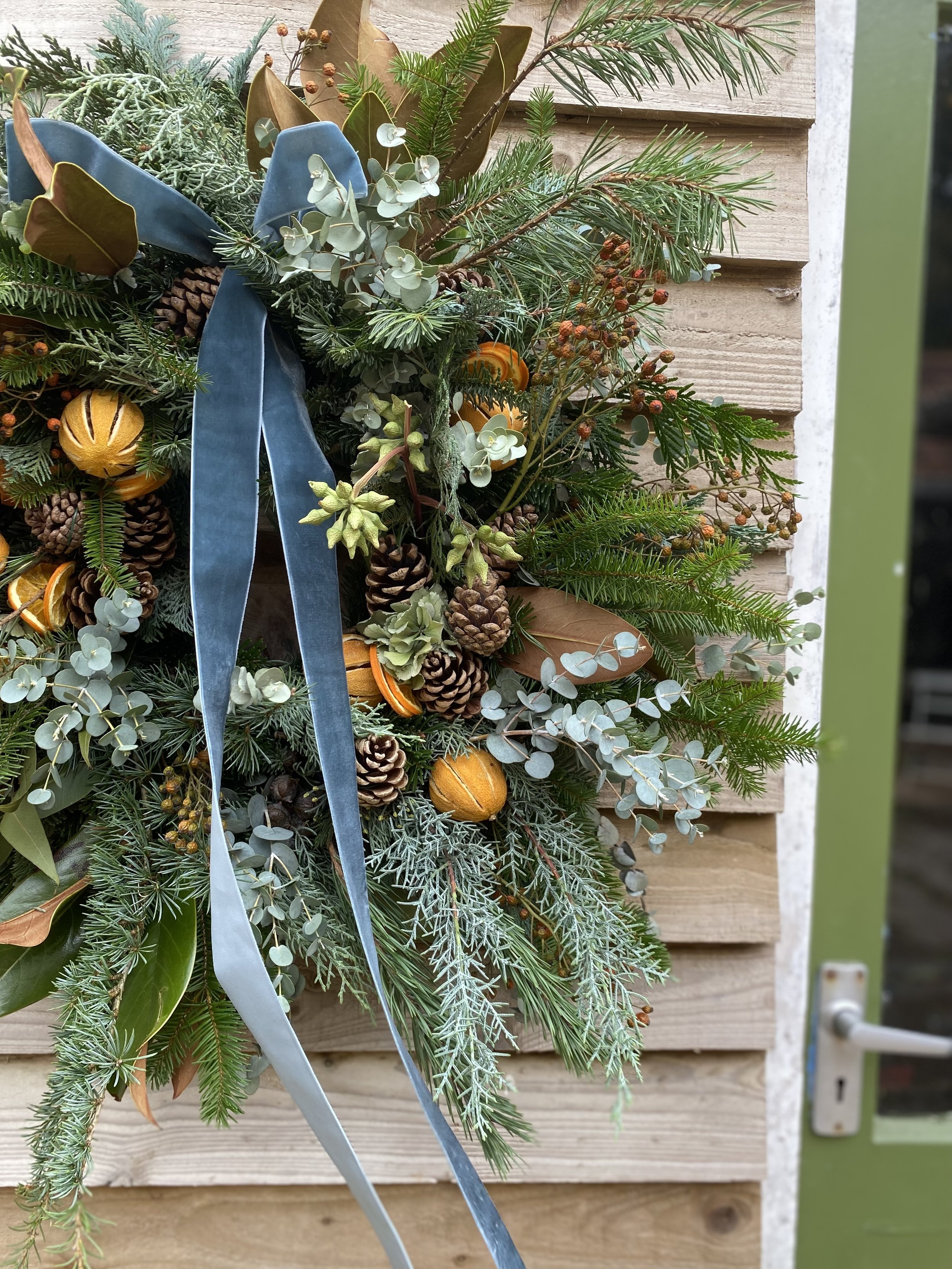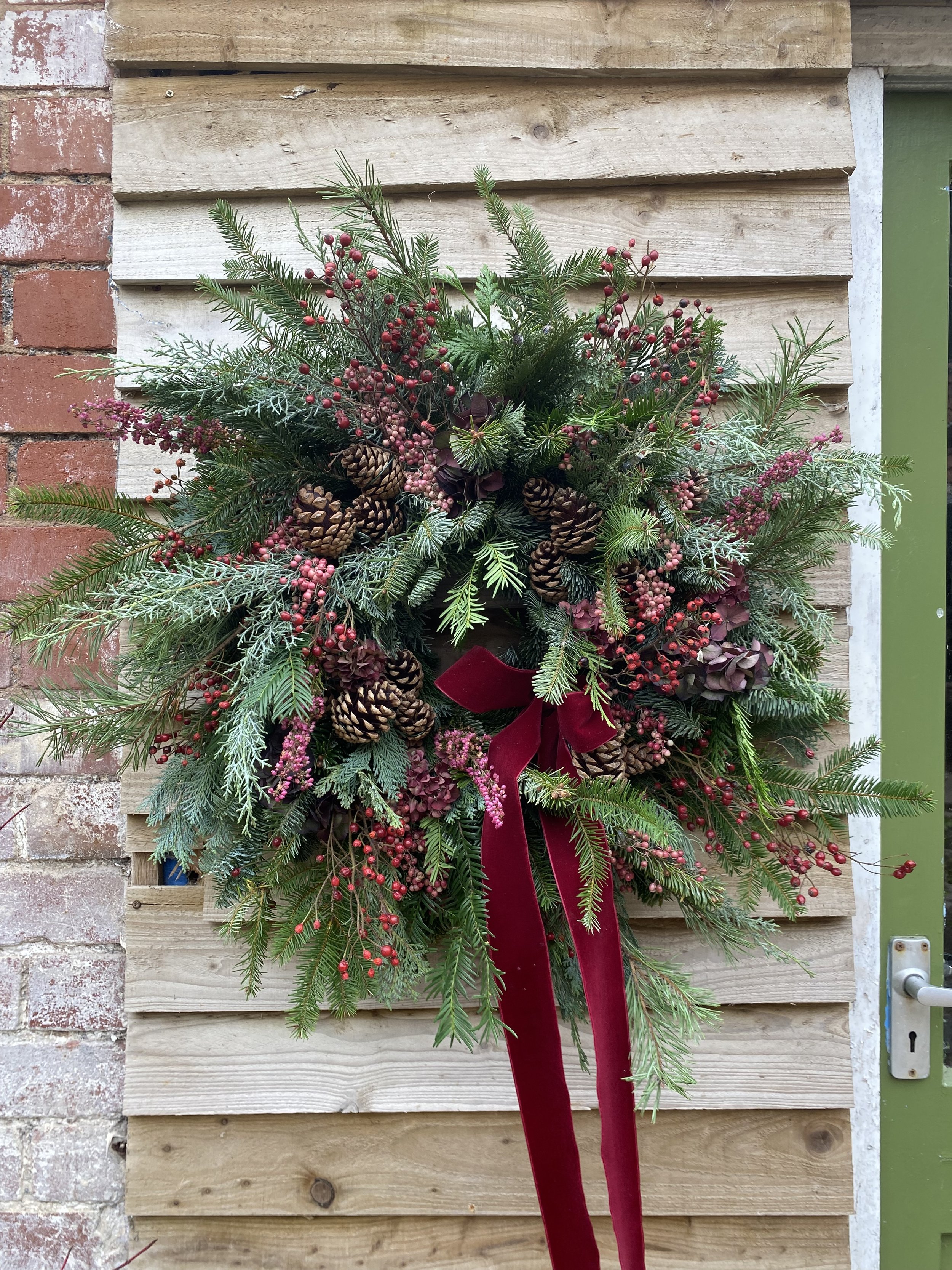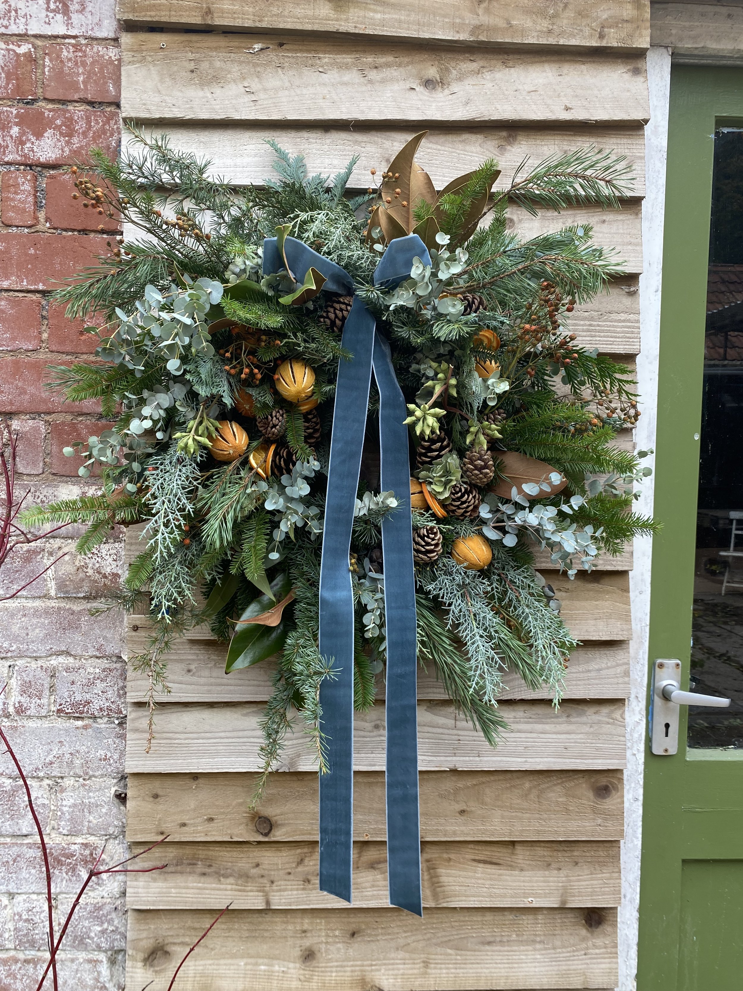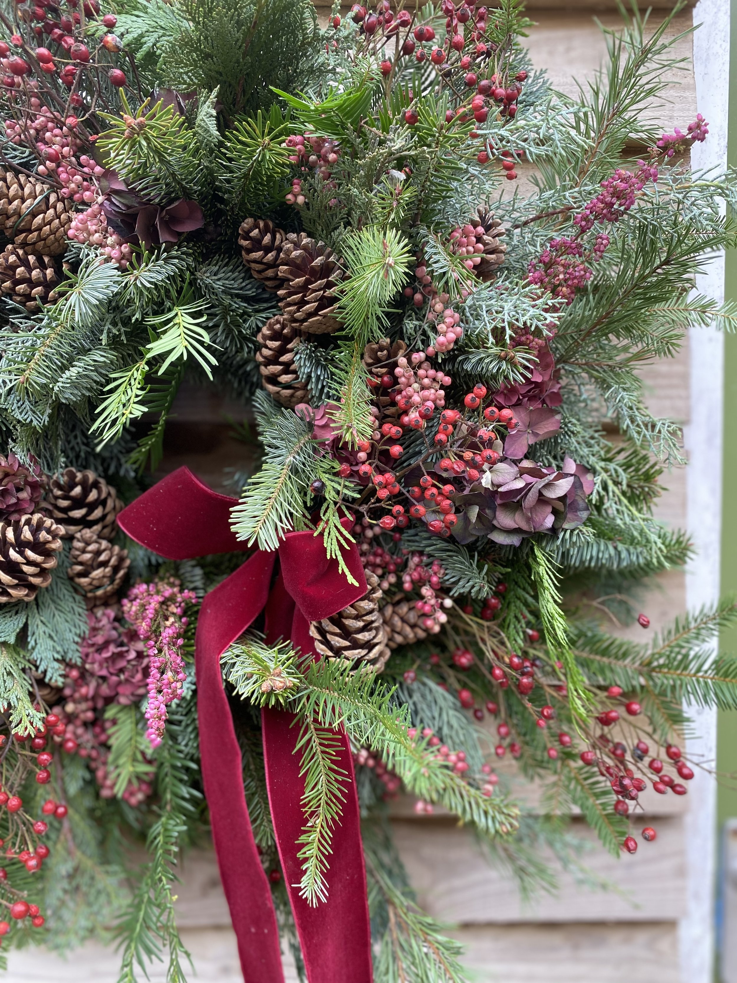 All Christmas wreaths are handmade to order in Lottie’s Somerset studio. Creatively designed and comprising of premium seasonal stems, the chunky foliage bases are made using a selection of fresh, scented winter greenery. Then they are decorated with various berries, seedheads and dried flowers & fruit. All finished with luxury velvet ribbons. See below for the selection of wreaths available to order this year.