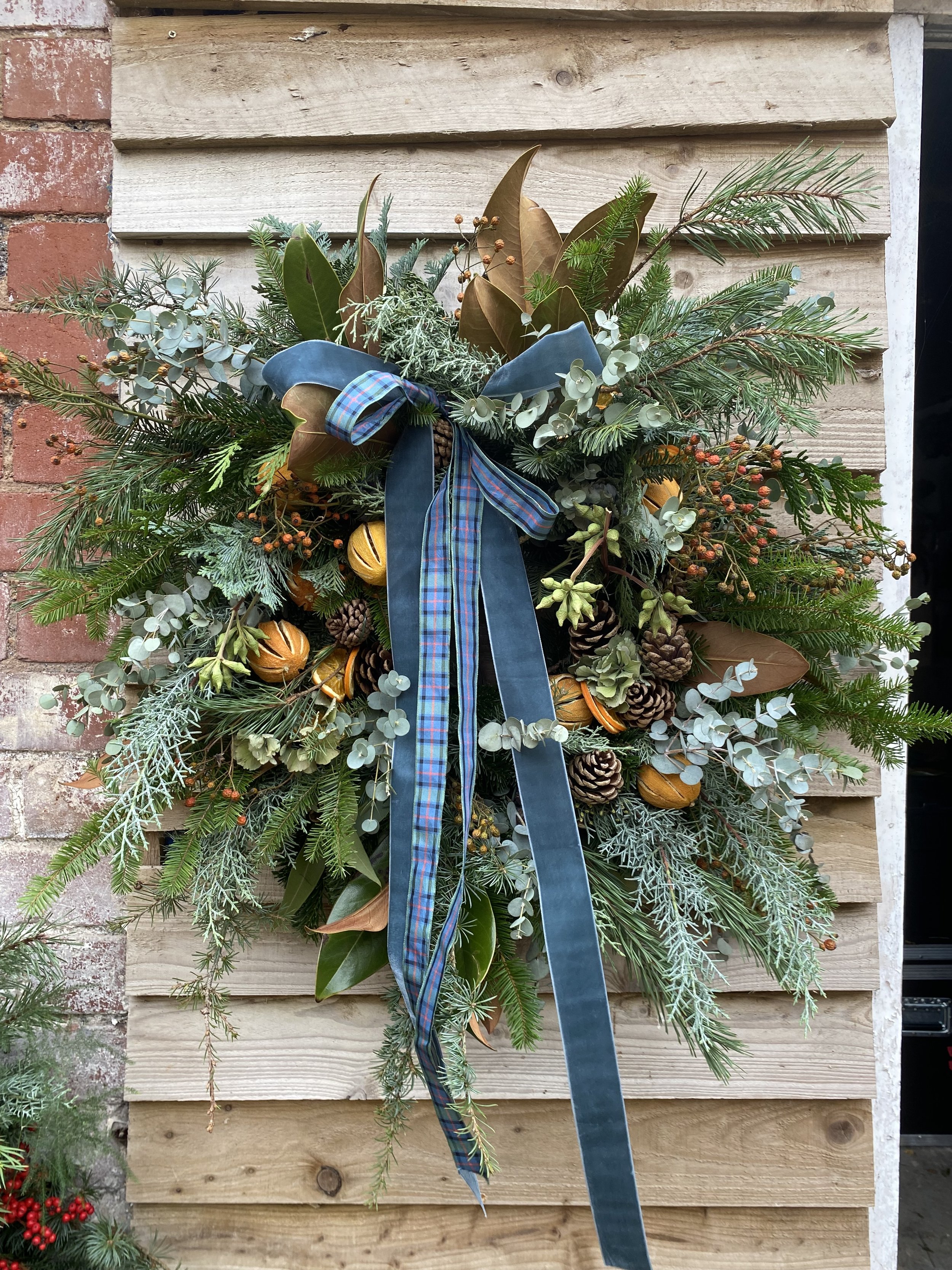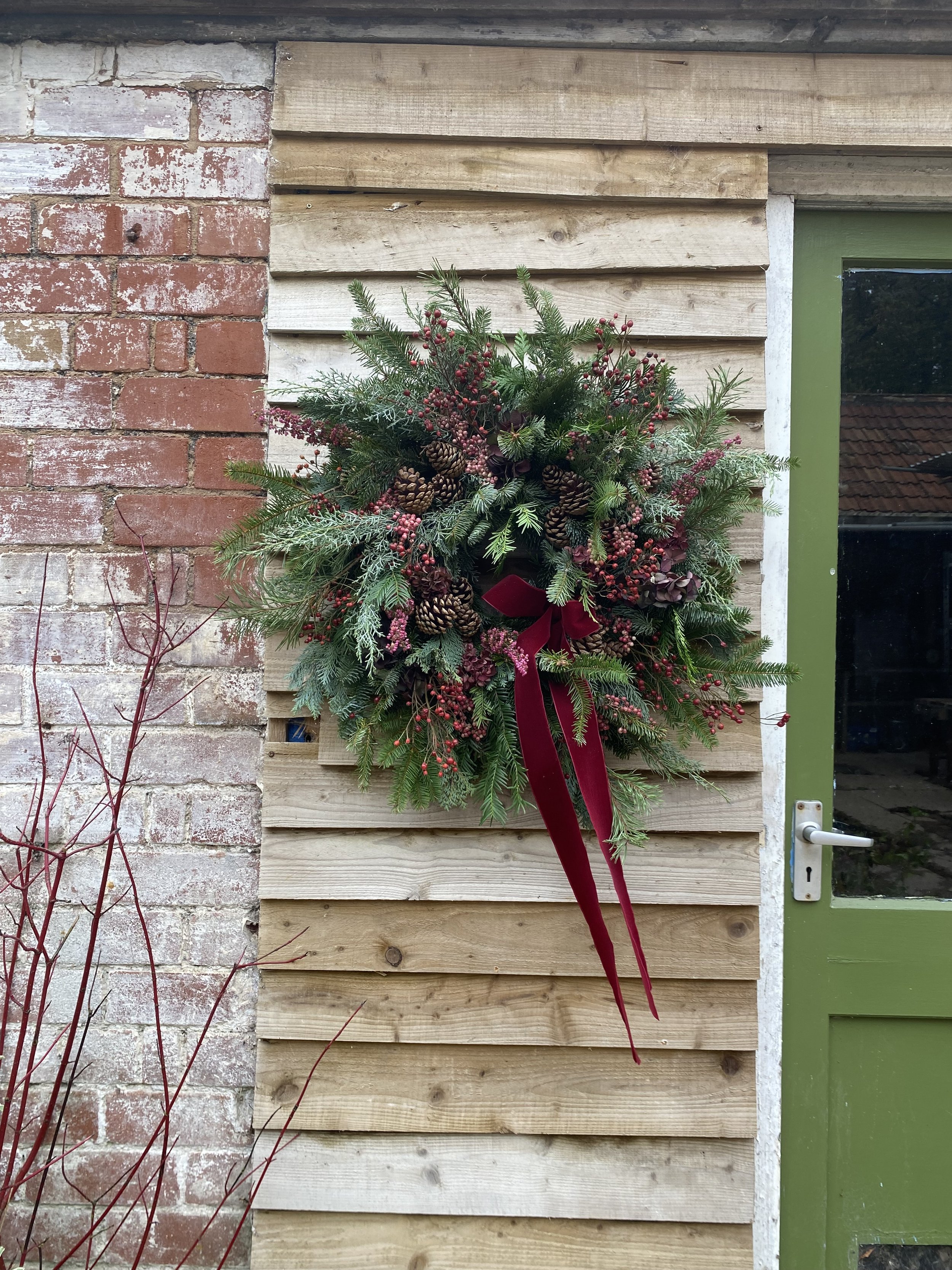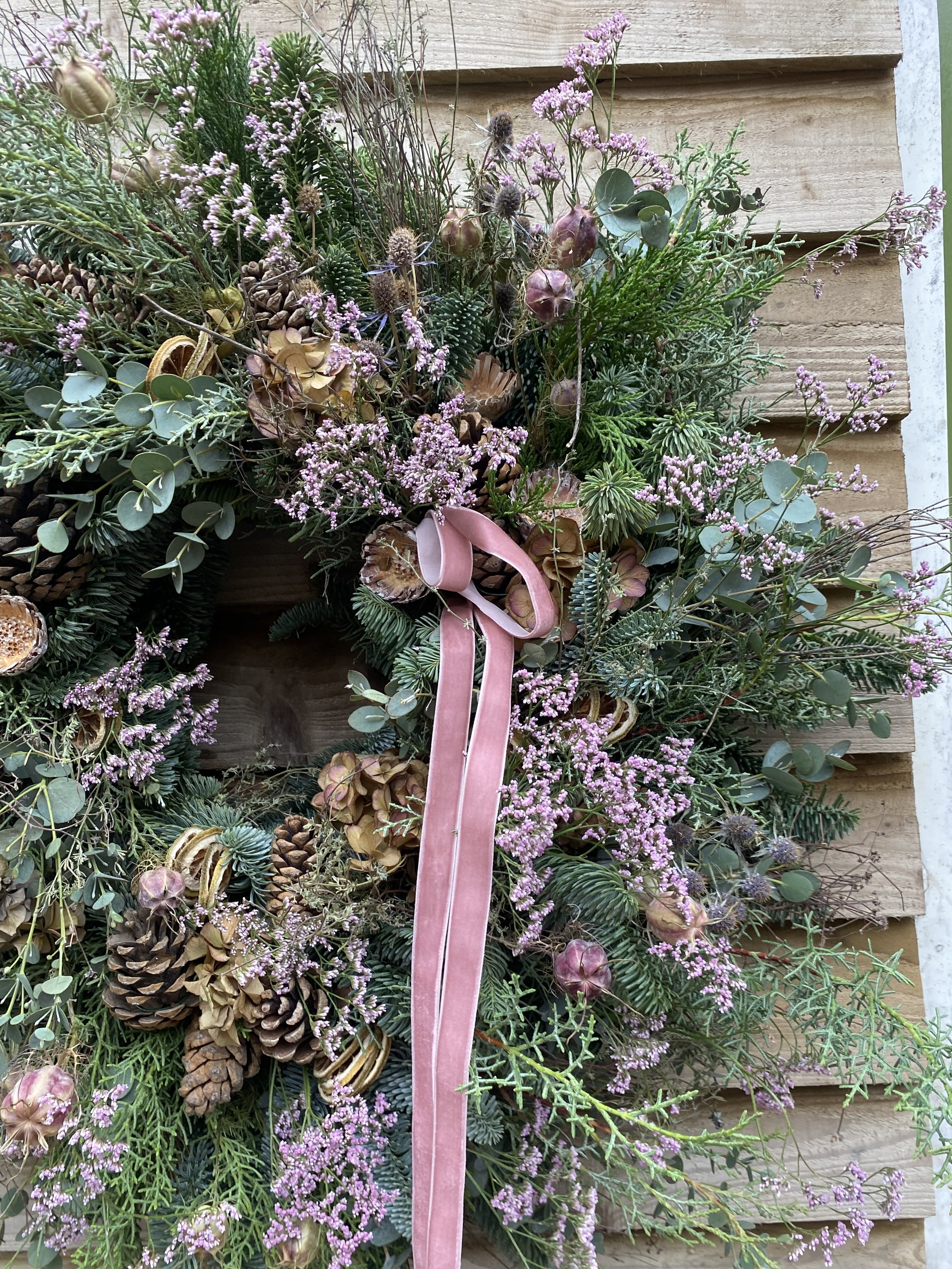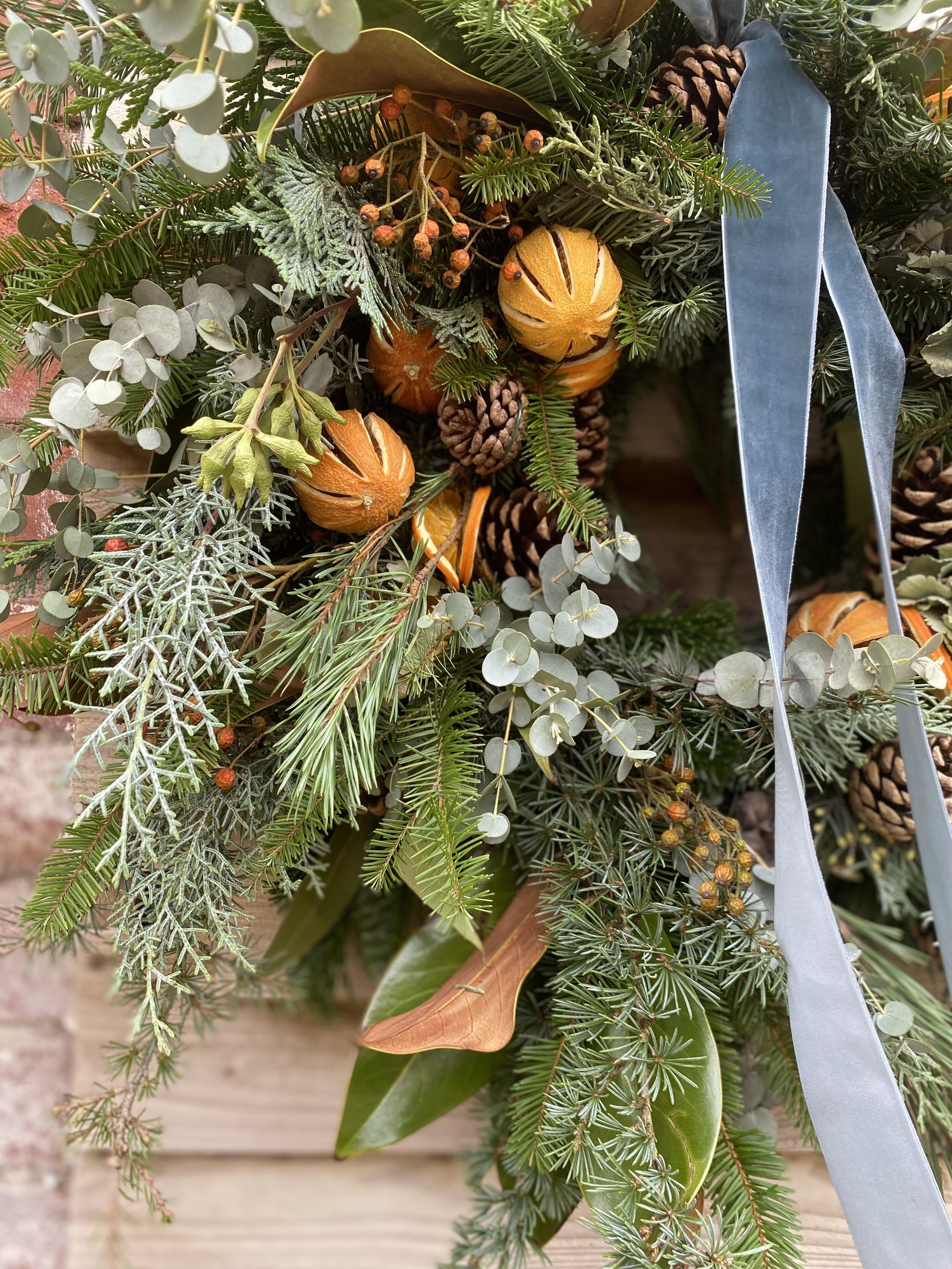 All Christmas wreaths are handmade to order in Lottie’s Somerset studio. Creatively designed and comprising of premium seasonal stems, the chunky foliage bases are made using a selection of fresh, scented winter greenery. Then they are decorated with various berries, seedheads and dried flowers & fruit. All finished with luxury velvet ribbons. See below for the selection of wreaths available to order this year.