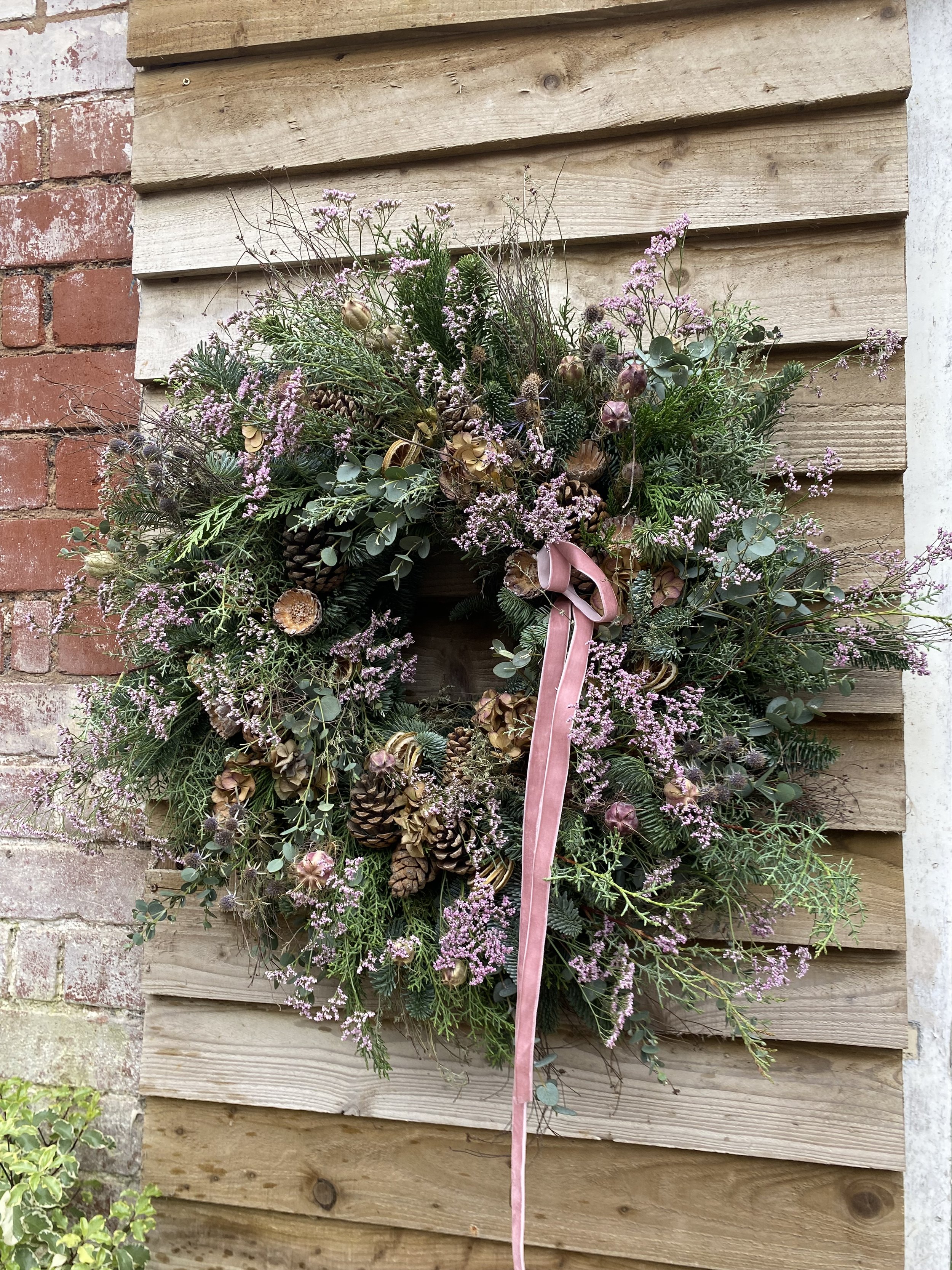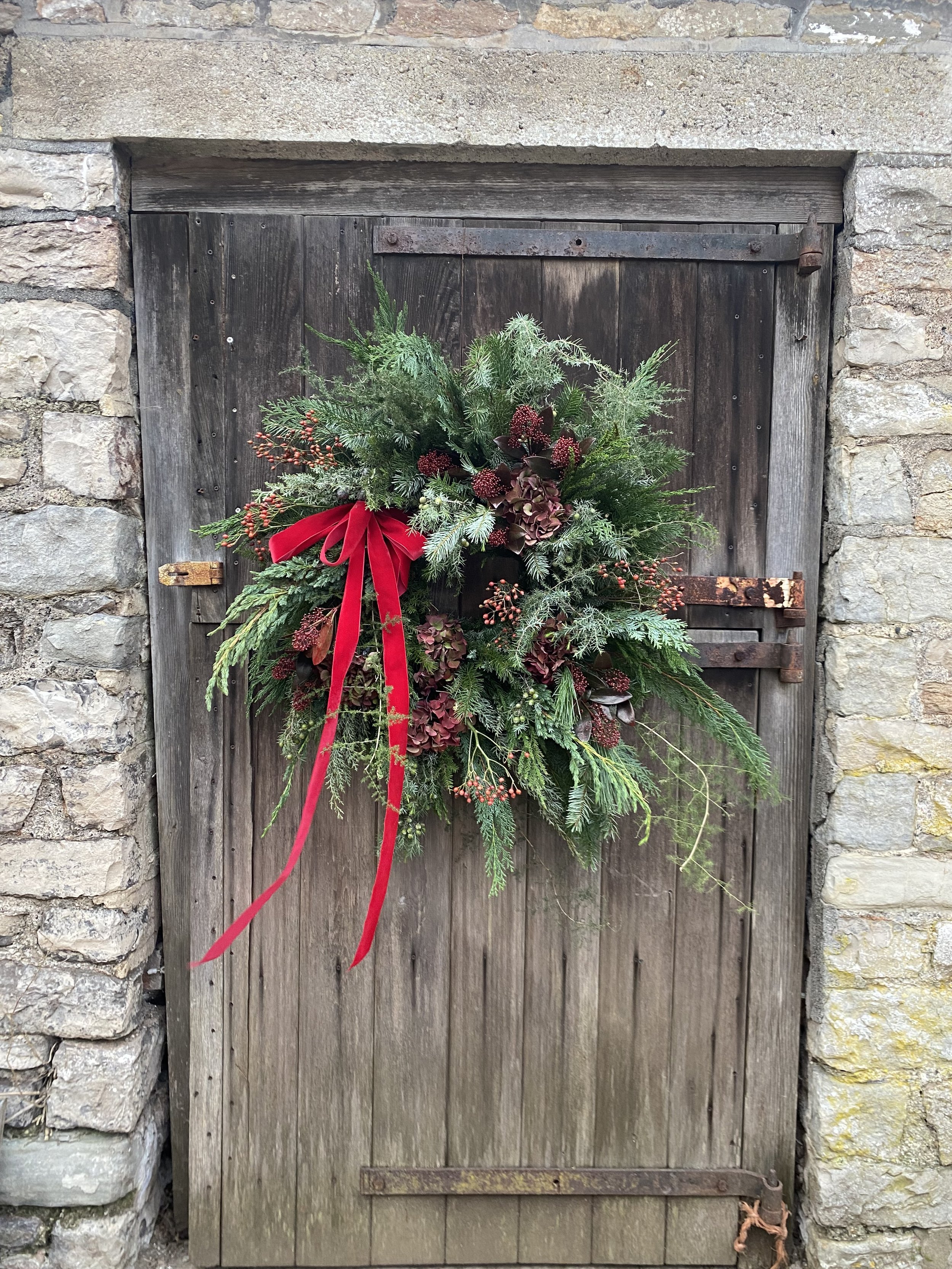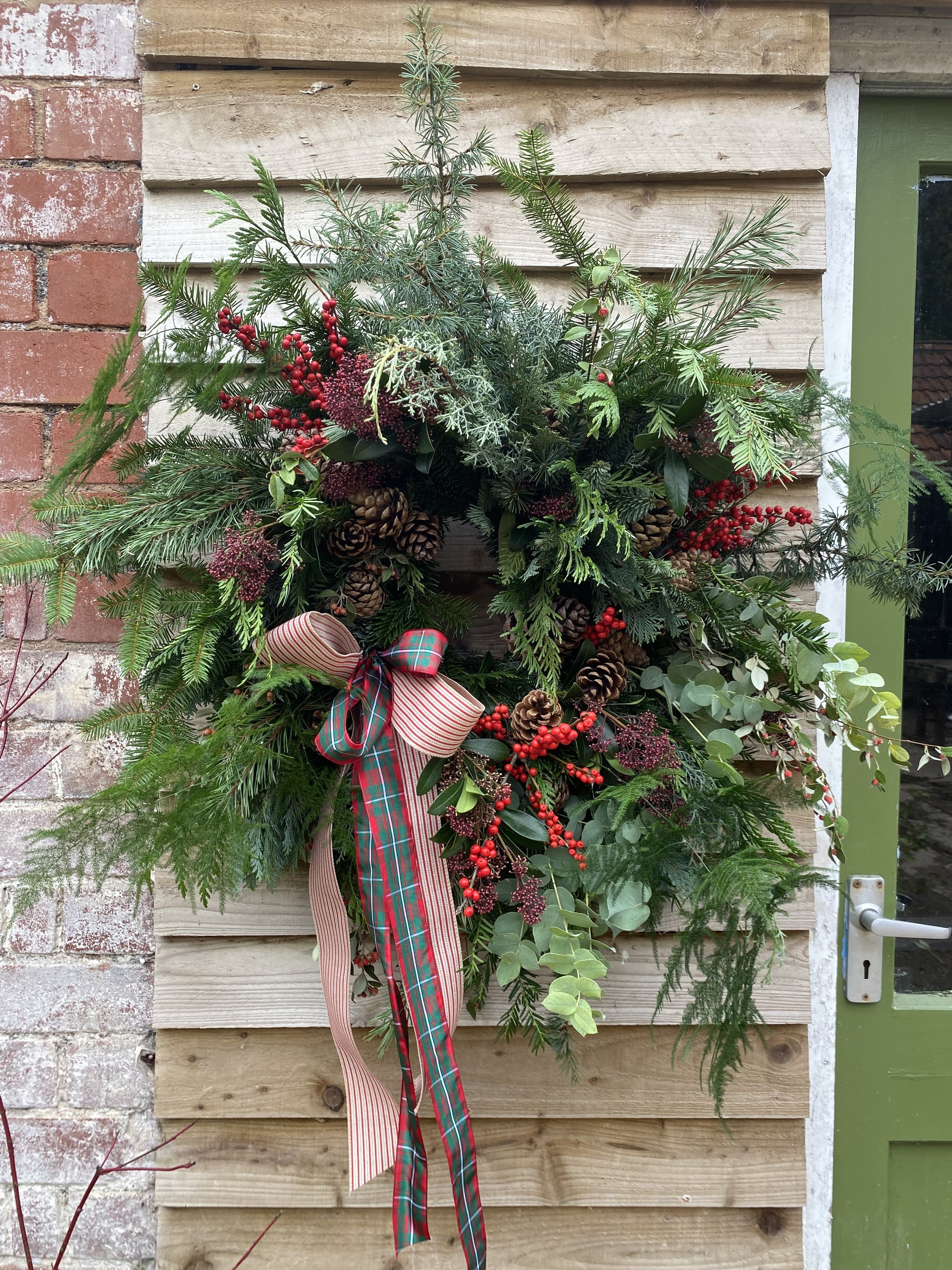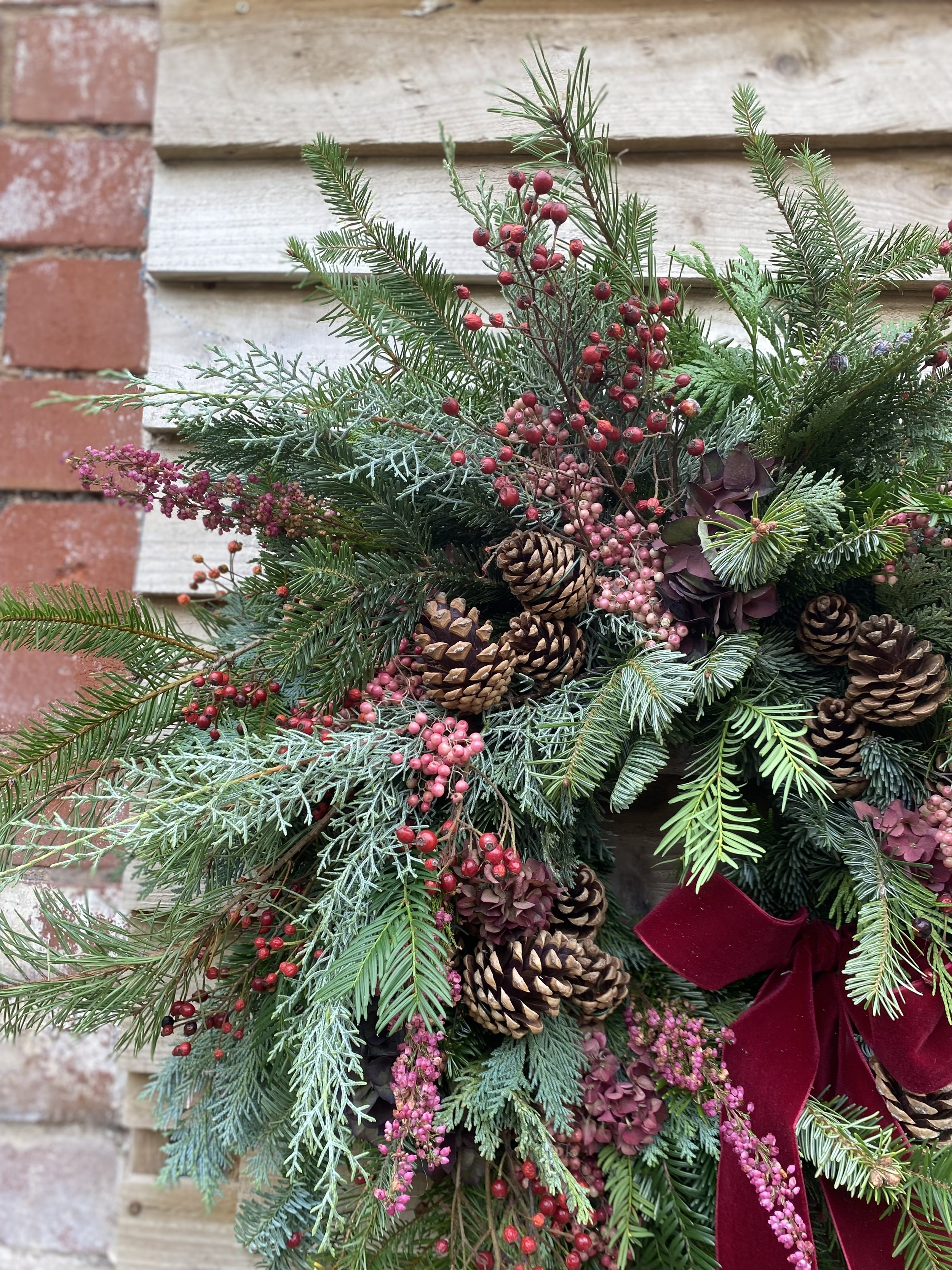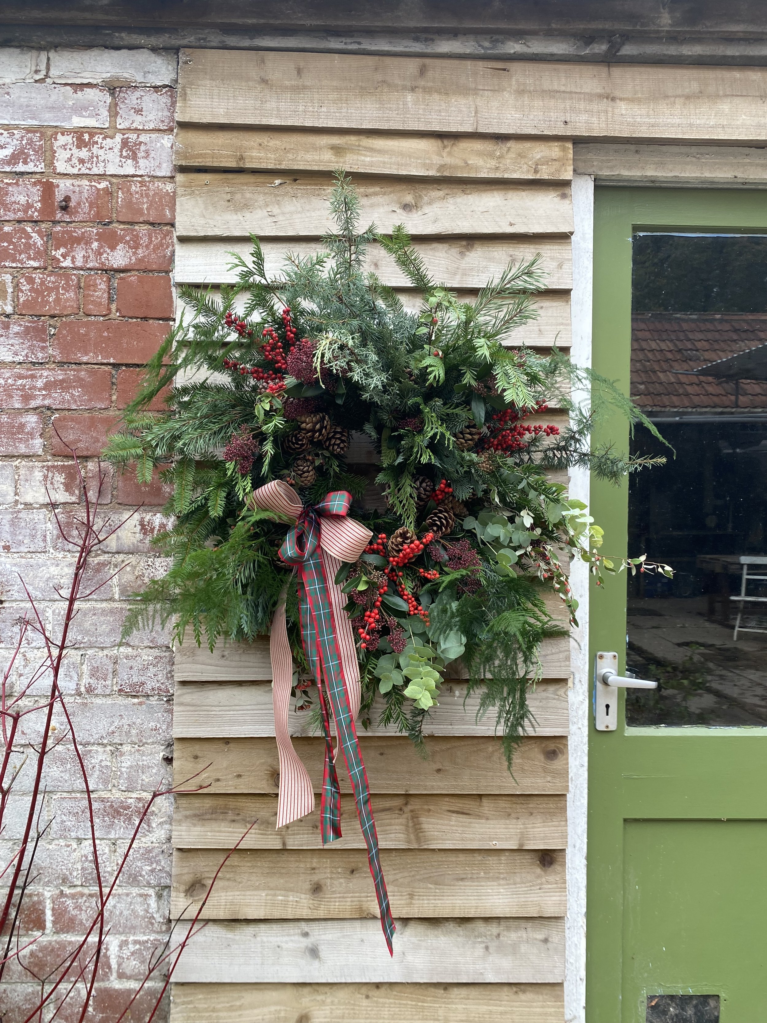 All Christmas wreaths are handmade to order in Lottie’s Somerset studio. Creatively designed and comprising of premium seasonal stems, the chunky foliage bases are made using a selection of fresh, scented winter greenery. Then they are decorated with various berries, seedheads and dried flowers & fruit. All finished with luxury velvet ribbons. See below for the selection of wreaths available to order this year.