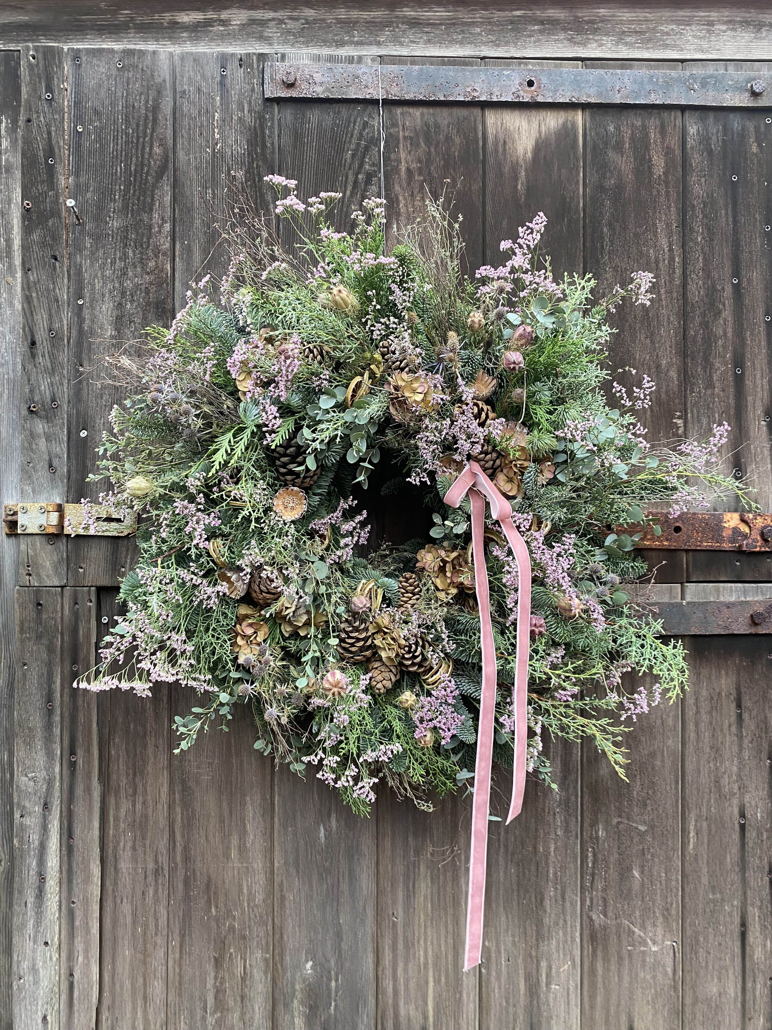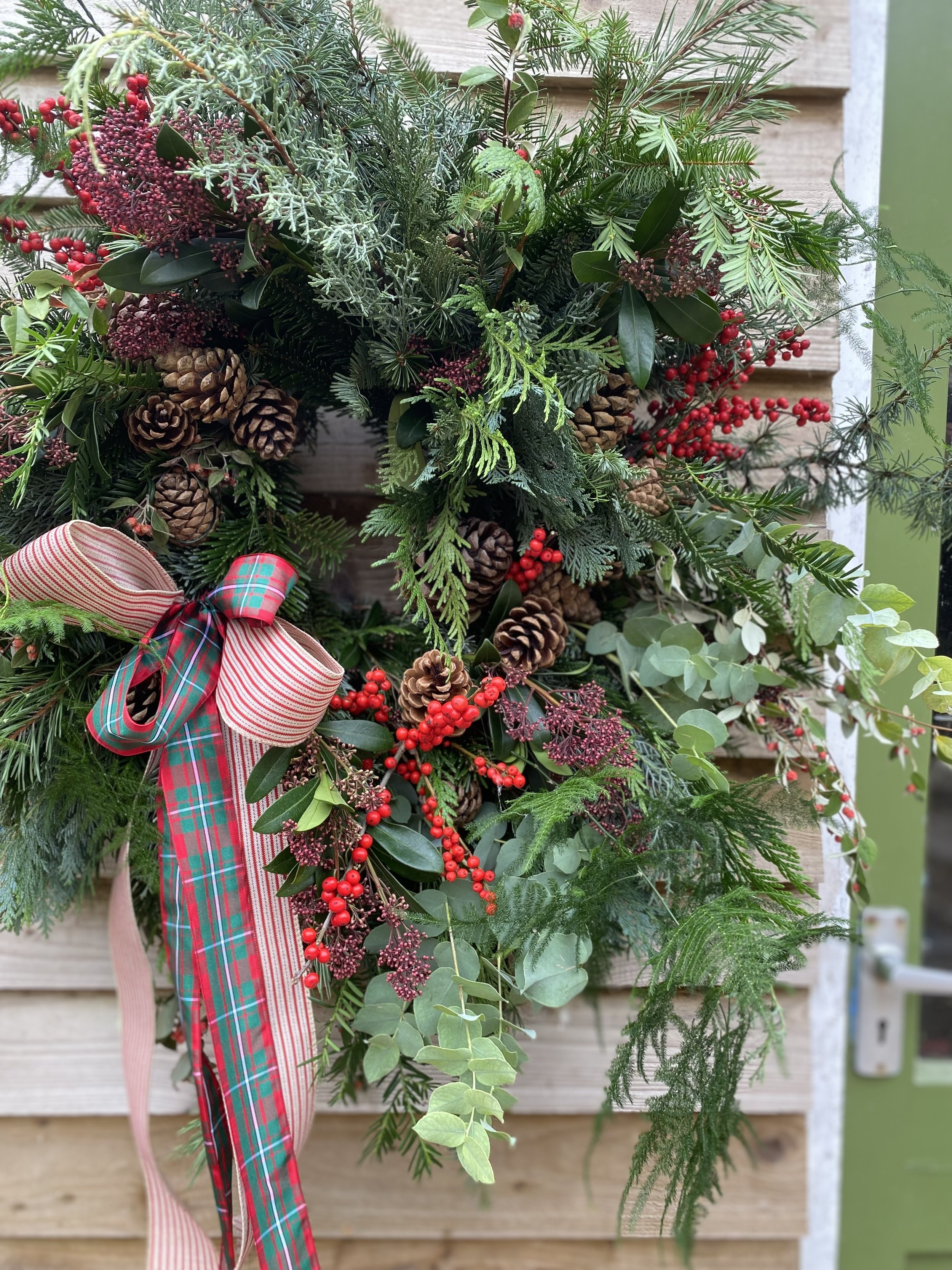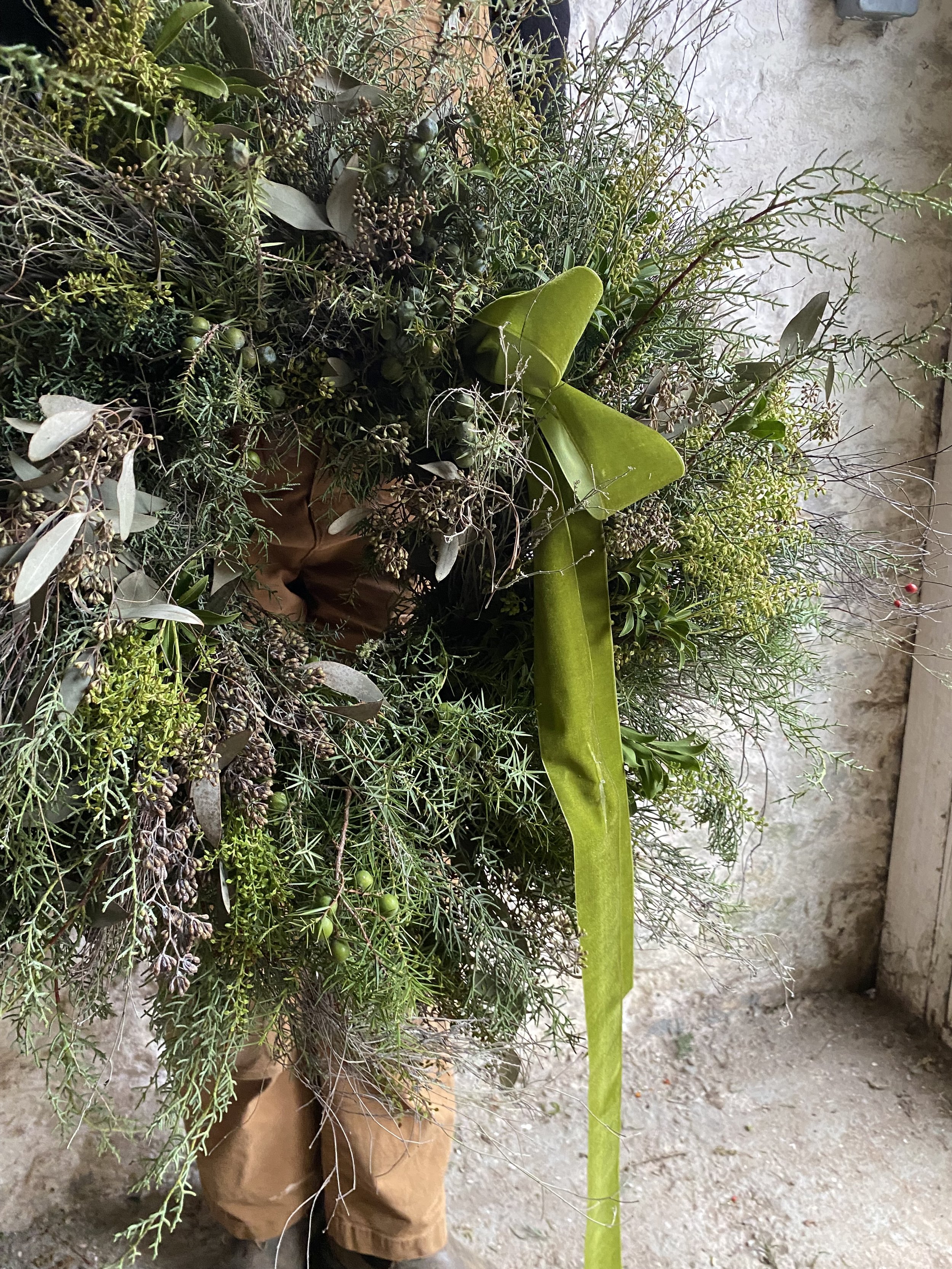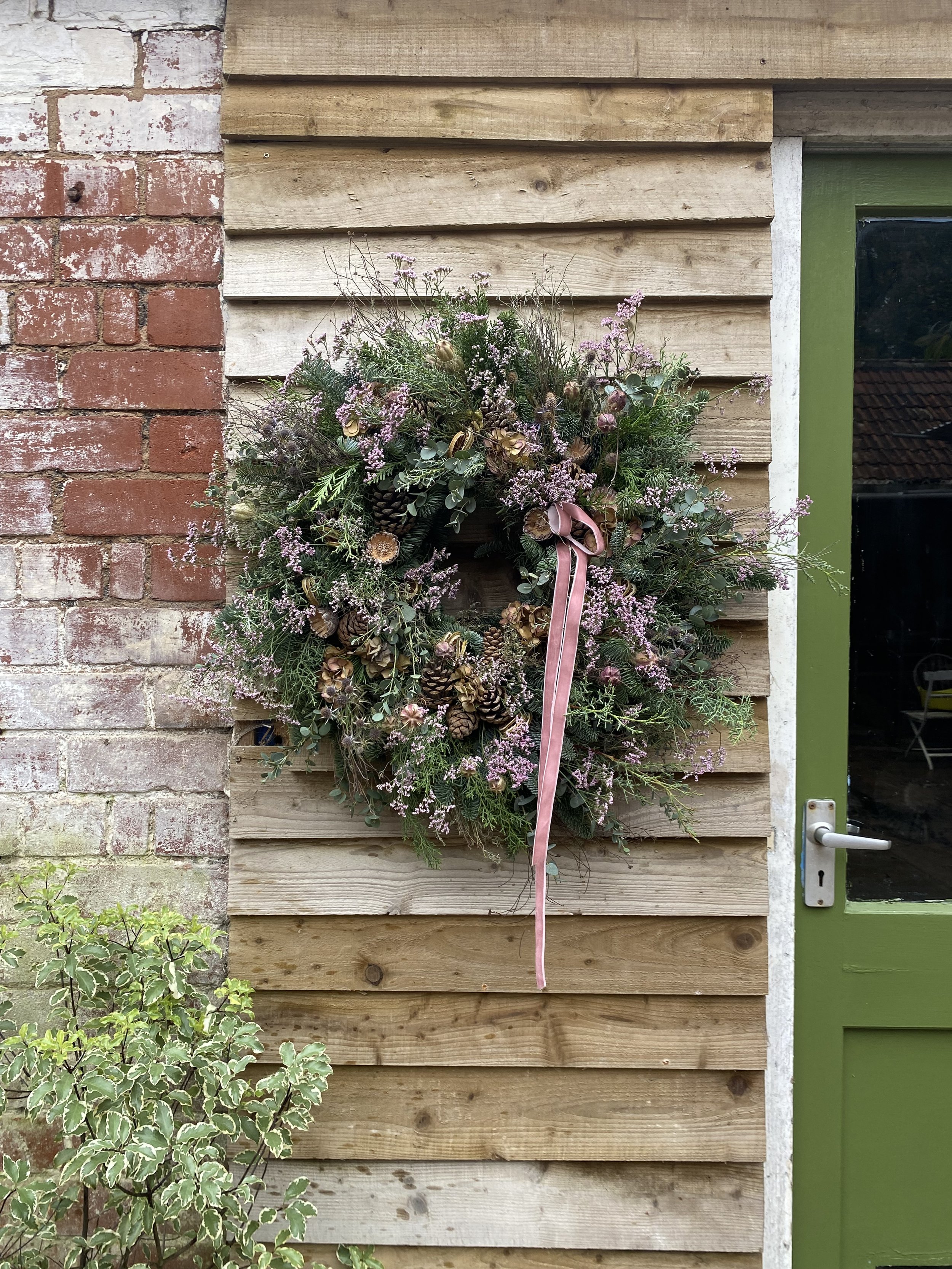 All Christmas wreaths are handmade to order in Lottie’s Somerset studio. Creatively designed and comprising of premium seasonal stems, the chunky foliage bases are made using a selection of fresh, scented winter greenery. Then they are decorated with various berries, seedheads and dried flowers & fruit. All finished with luxury velvet ribbons. See below for the selection of wreaths available to order this year.
