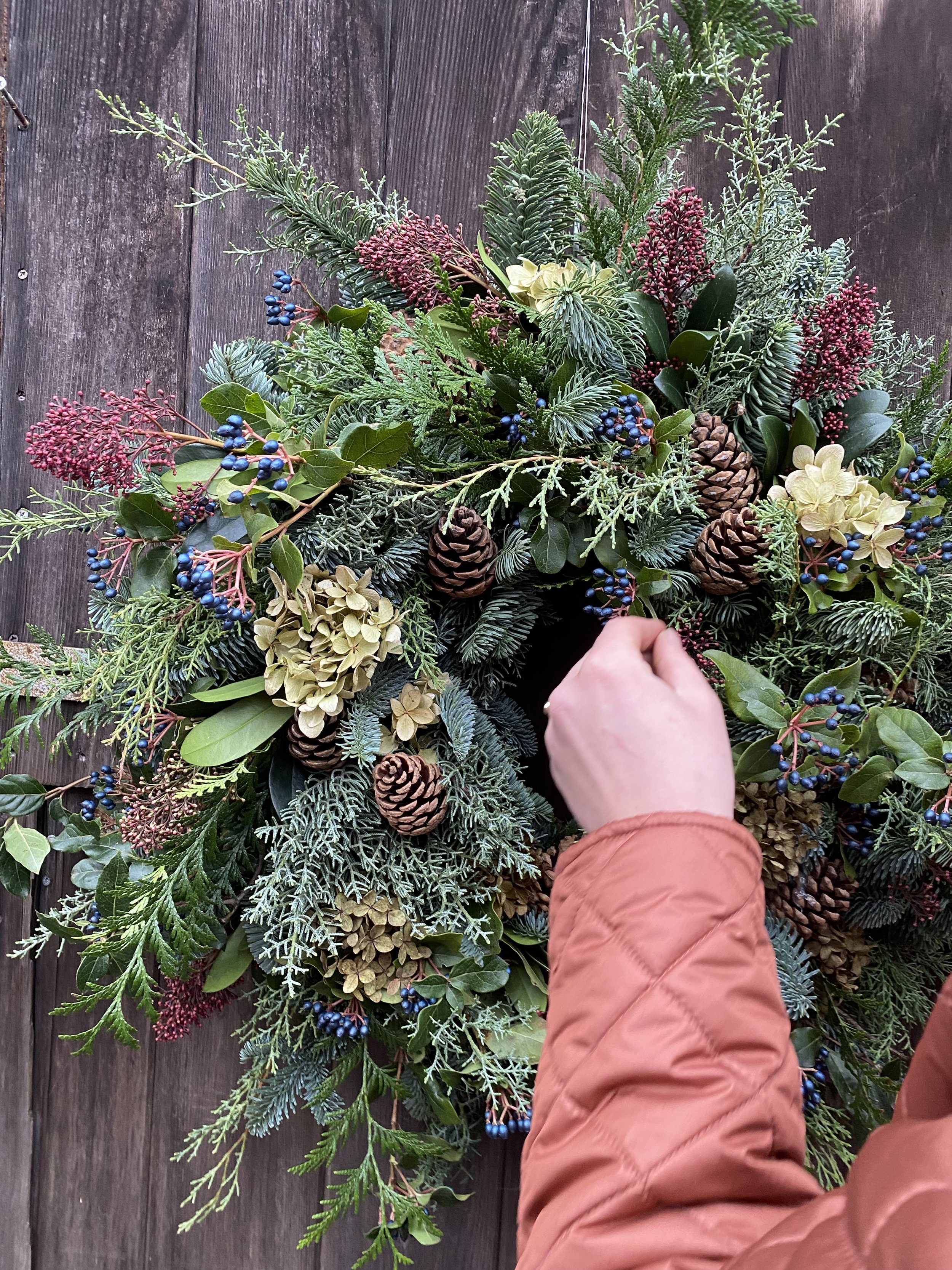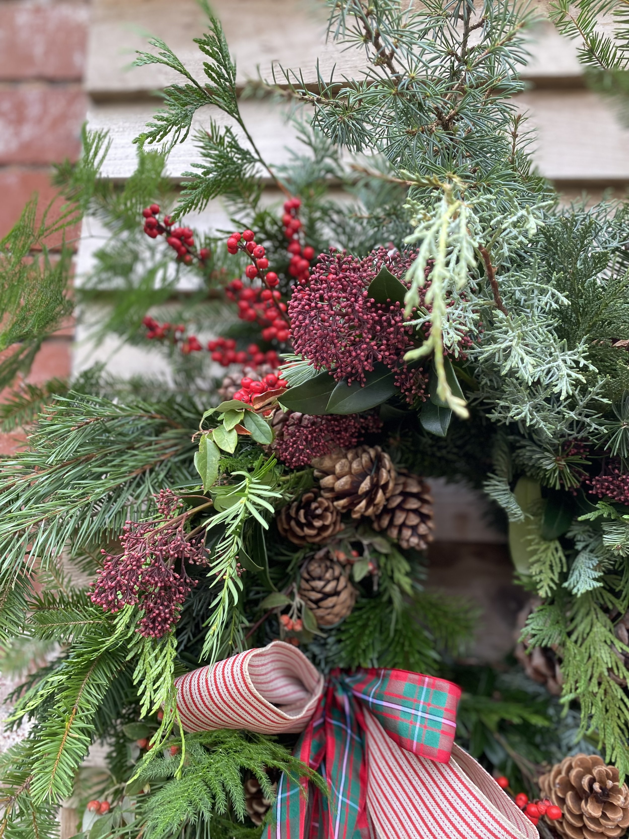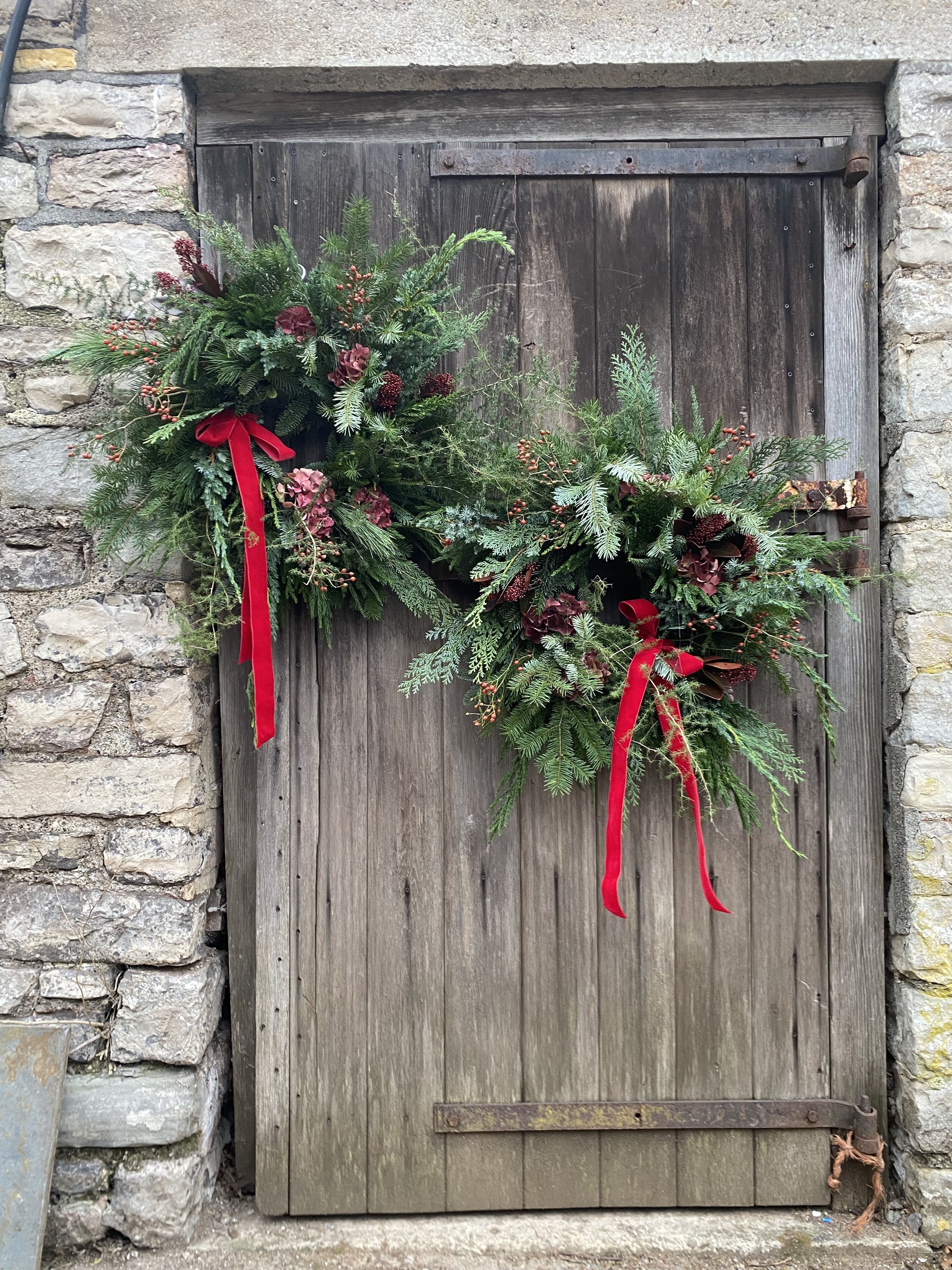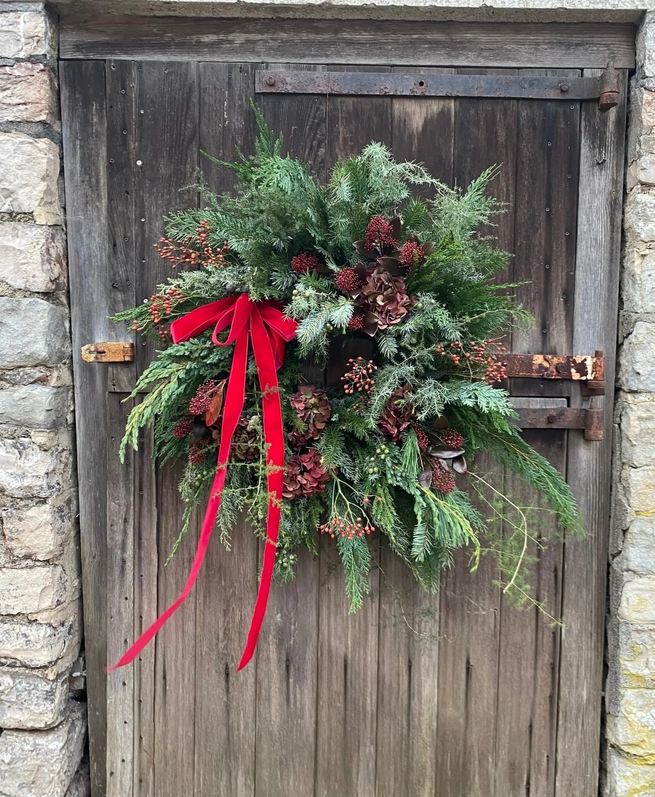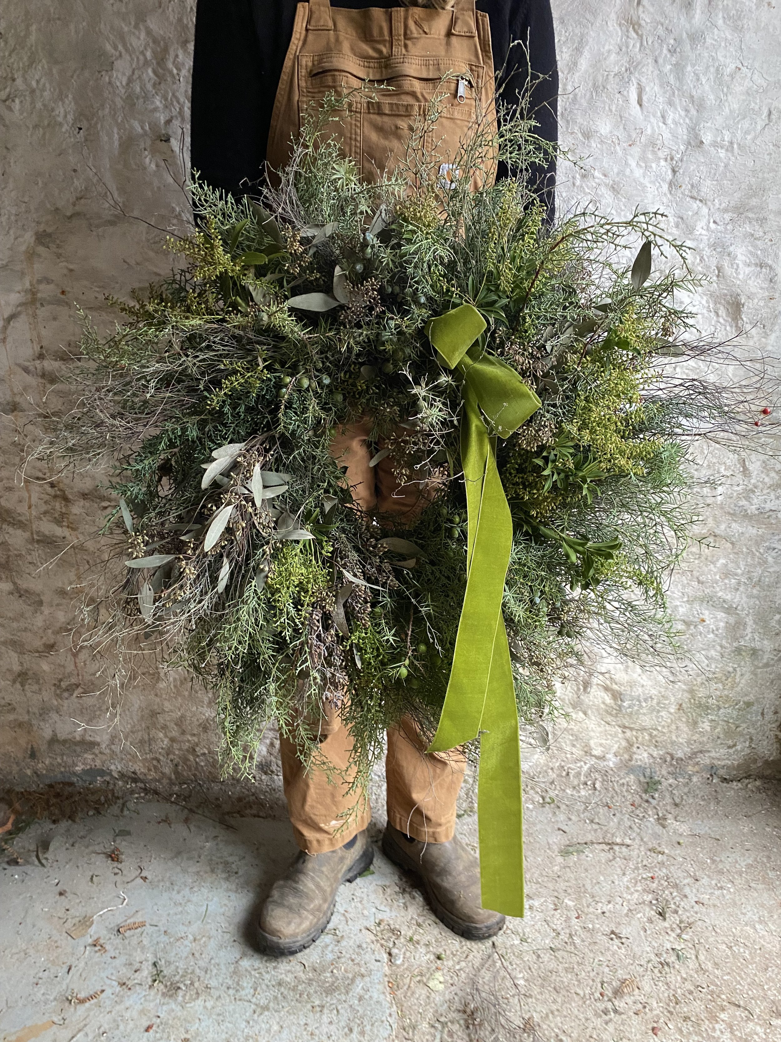 All Christmas wreaths are handmade to order in Lottie’s Somerset studio. Creatively designed and comprising of premium seasonal stems, the chunky foliage bases are made using a selection of fresh, scented winter greenery. Then they are decorated with various berries, seedheads and dried flowers & fruit. All finished with luxury velvet ribbons. See below for the selection of wreaths available to order this year.